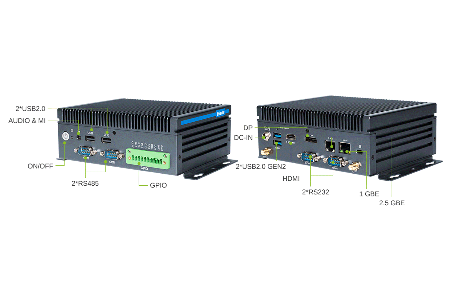 AF208配备了丰富的I/O接口,机身配备4个COM串口便于连接PLC、传感器等工业设备;10针GPIO接口支持数字信号控制与扩展;1个2.5GbE网口、1个千兆网口,支持数据同步上传至MES系统,还有2个高清视频显示接口,能够快速将收集到的设备数据显示在屏幕上,方便操作员检查。