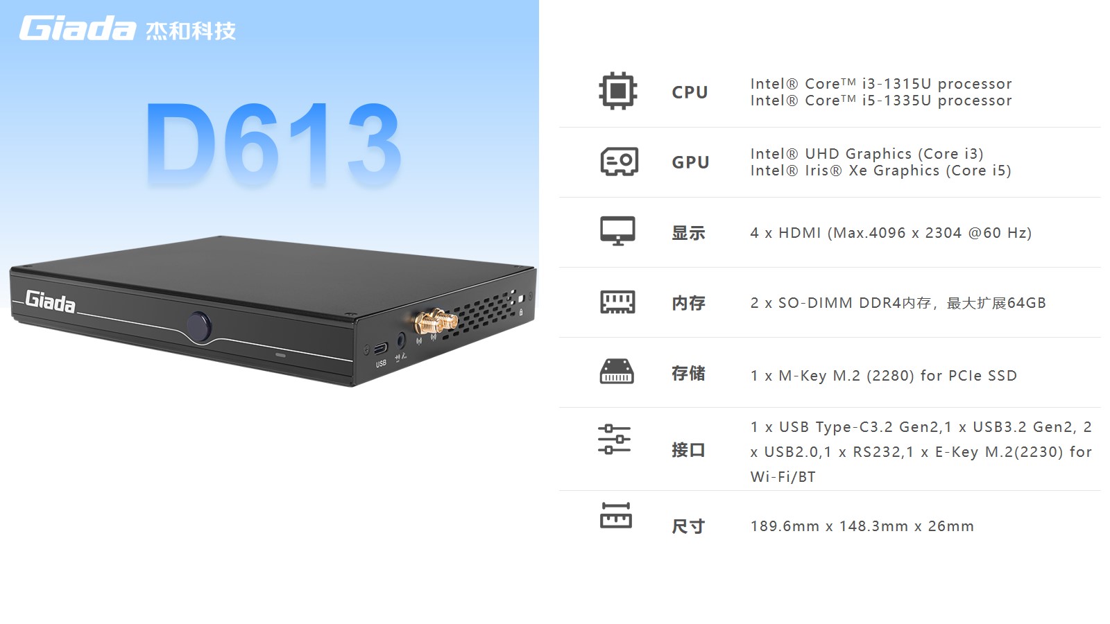 三亿数字标牌D613搭载Intel RaptorLake Corei3-1315U/i5-1335U处理器,可以同时连接4个4K显示器,支持4K分辨率编码解码,还支持5G蜂窝网络,速度比4G LTE快10倍。