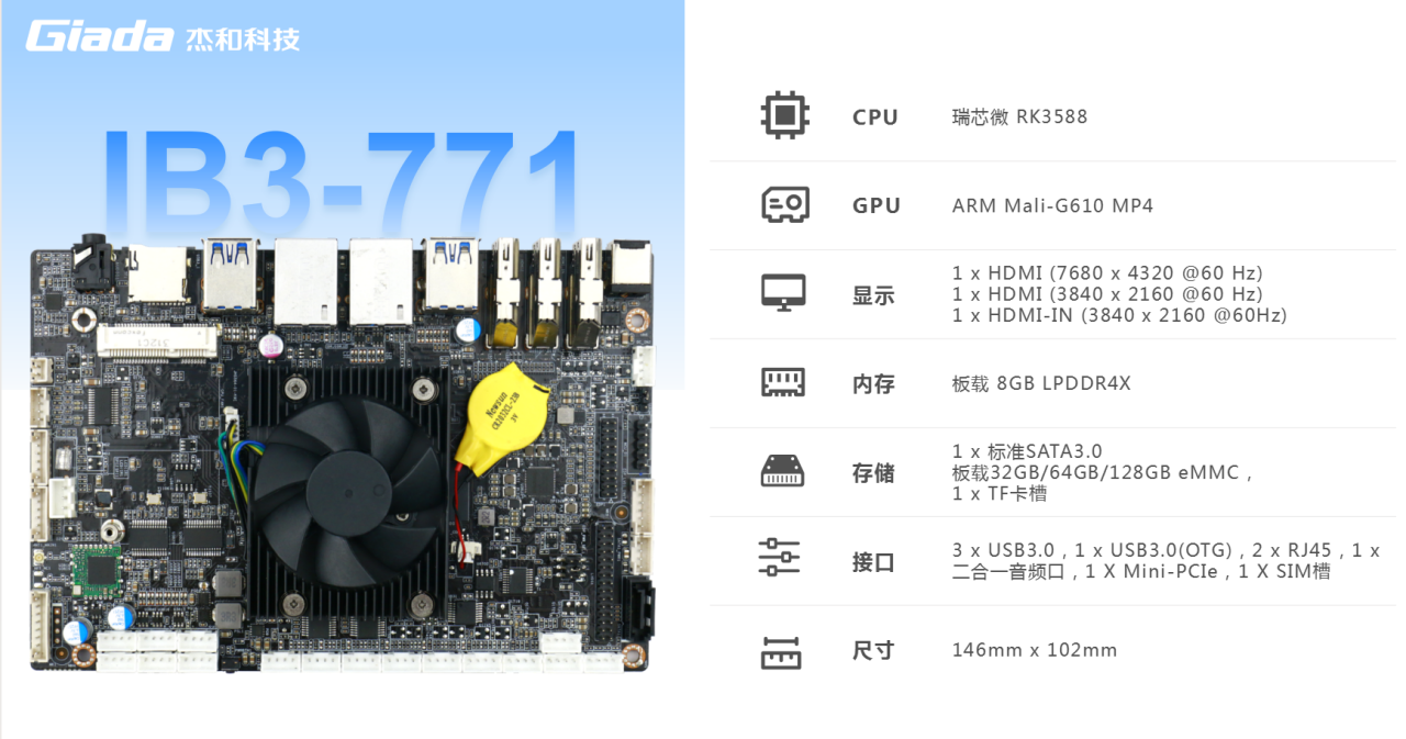 三亿主板IB3-771搭载瑞芯微RK3588八核64位处理器,内置6TOPS算力的NPU,具备高算力、内存大、超强多媒体、多重扩展等技术优势。满足8k超高清视频的显示需求,还支持主流深度学习框架,为各类 AIOT 应用场景提供更优的性能表现,支持机器人、边缘计算、智能NVR、智能汽车、智慧大屏、AR/VR、智能自助终端场景的广泛应用。